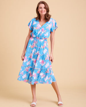 Fits great across the shoulders and a lot of room around the bust and waist so fits lots of body types. The tie front lets you cinch your waist in. Probably size down if you're in between sizes or think you may lose weight.
