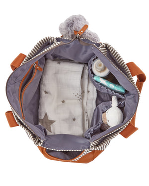 The Peachymama® nappy bag in a dawn grey stripe, with contrast handles and trim and roll out change mat helps make your job easier when you’re out and about.